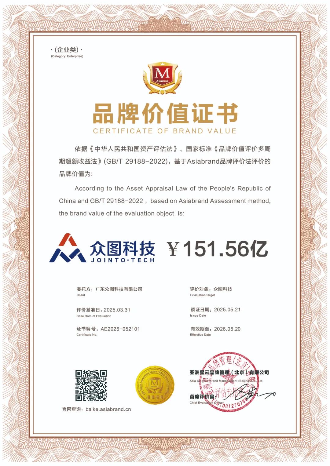 品牌作为企业最重要的资产,通过科学的价值测评,不但有利于企业管理品牌,实现公司战略目标,为消费者带来更多的效用,还能为企业提供新的资产依据和增信依据,带来更优良的融贷服务。经Asiabrand专业评价, “众图科技”2025年品牌价值为151.56亿元。这一数字不仅标志着这家人工智能领域领军企业的品牌实力再攀高峰,更在世界舞台上为中国科技企业的价值标杆添上浓墨重彩的一笔。
