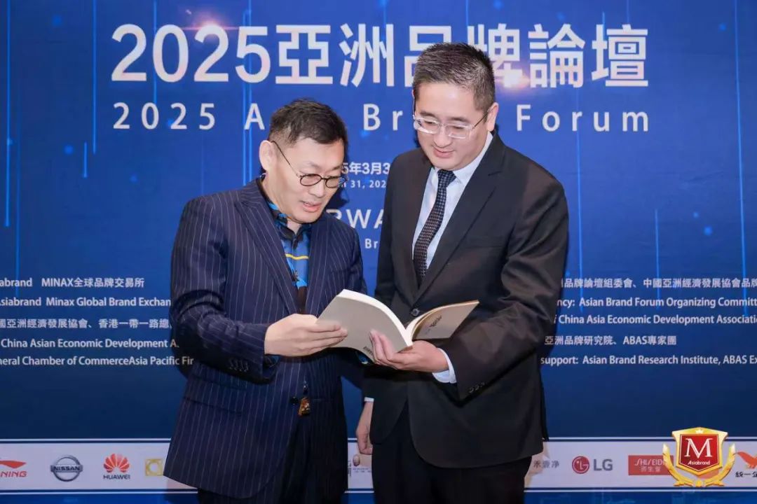 香港特别行政区政府商务及经济发展局副局长陈百里(右)在观看《王建功论品牌》一书。