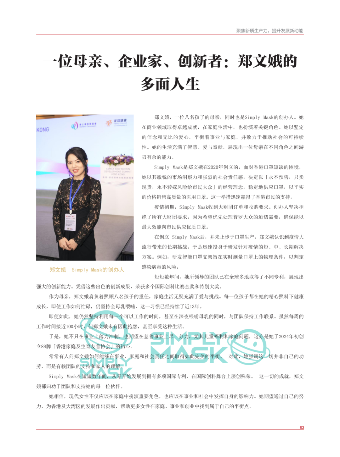 2020 年,新冠疫情肆虐,香港口罩告急。郑文娥秉持“永不预售,只卖现货,不转嫁风险给市民”的理念,创立 Simply Mask,以平实价格供应高品质医用口罩,迅速成为 26 万香港市民的首选,获称“师奶口罩厂”。为确保口罩质量,她建立 ISO 13485 质量检测系统、ISO14644 - 1 Class 7 无尘车间与小型实验室,严格把控生产环节。凭借这份坚持与高效管理,2022 年 Simply Mask 获“五星口罩”评级,获评“香港性价比第二高的本地口罩生产商”。